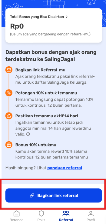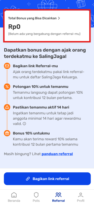 Program dari Asuransi SalingJaga yang memberikan imbalan kepada peserta yang mereferensikan produk asuransi tersebut kepada orang lain. Jika ada orang yang tertarik dan membeli asuransi SalingJaga melalui referral Anda, Anda akan mendapatkan "Bonus".