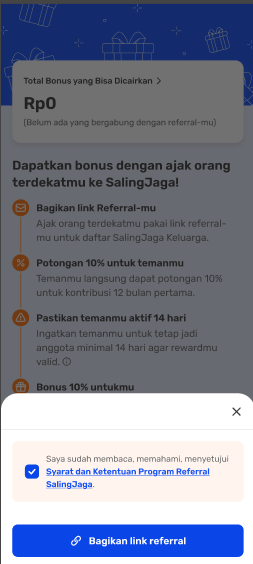 - Baca dan setujui dengan ceklis “Syarat dan Ketentuan Program Referral SalingJaga”